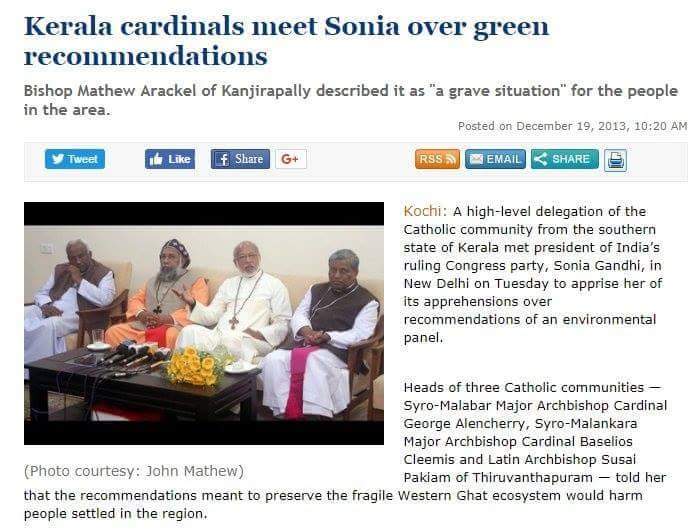 तीनों प्रमुख पादरियों ने सोनिया को कंस्तूरीरंगन के प्रस्ताव से ईसाइयों को होने वाले नुकसान के बारे में बताया। साथ ही उन्होंने उस बैठक में सोनिया गांधी से यह आश्वस्त करने को कहा कि किसी भी सूरत में वेस्टर्न घाट से लोगों को खाली नहीं कराया जाएगा। यहां यह लिखने की जरूरत नहीं कि सोनिया गांधी ने क्या किया?