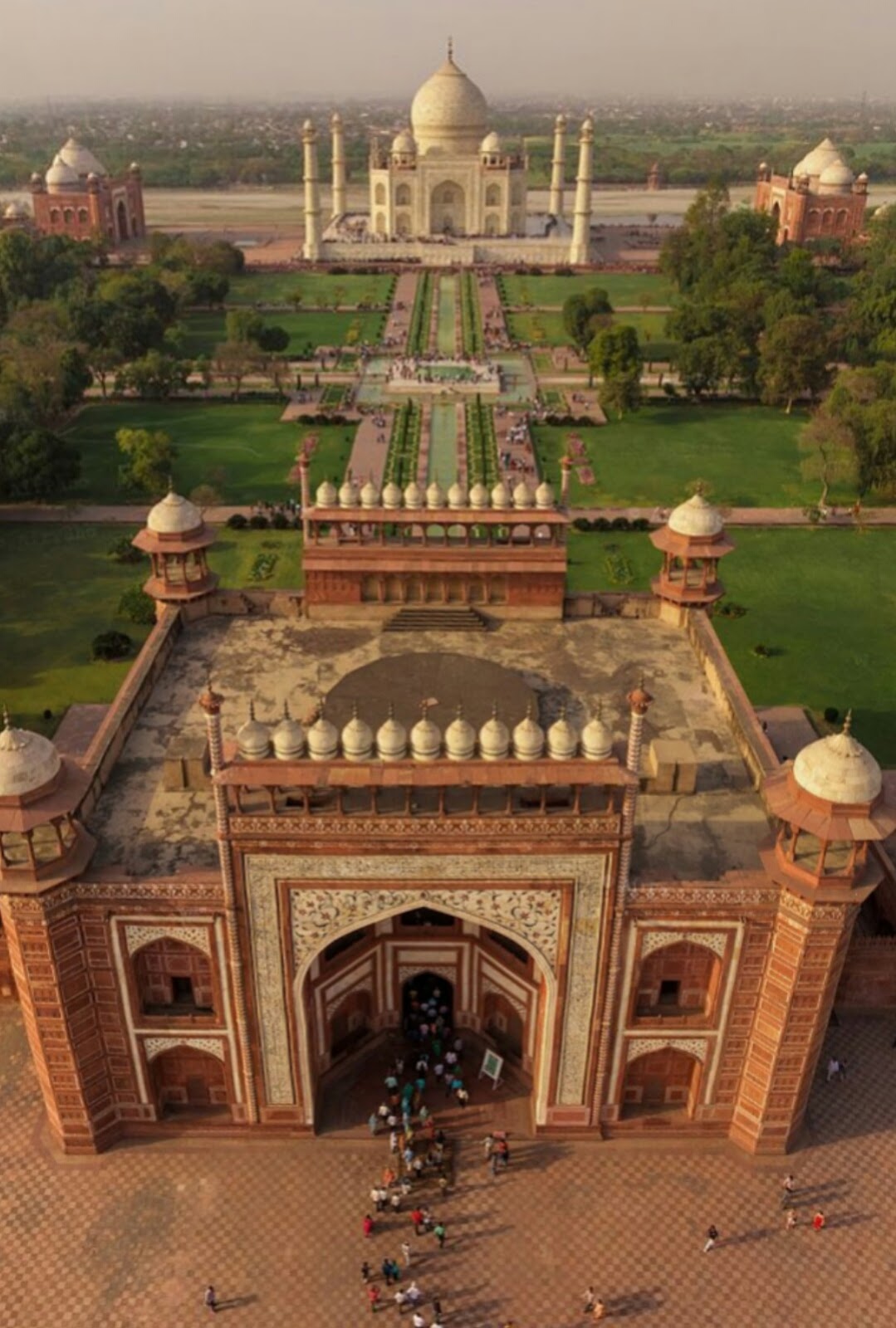 अब हम भीतर चलते हैं, भीतरी फाटक पार कर एक ऊँचे चबूतरे पर खड़े हैंं, सामने मध्य में फव्वारों की पंक्ति है। उनके दोनों ओर मोरपंखी के वृक्षों की पंक्ति, कुछ छोटे, कुछ पूरे। यहाँ से स्फटिक श्वेत विशाल भवन अपनी शुभ्र आभा को बिखेरता हुआ स्पष्ट दिखाई देता है। इसी को ताजमहल कहते हैं। इसके विशाल फाटक के ऊपर अधखिला कमल पुष्प, पुष्प के दोनों ओर की बनी बेलें जो अति लुभावनी हैं। उसके ऊपर कुरान लिखी है। उसके गुम्बज की चित्रकारी भी स्पष्ट दिखाई देती है। यह सभी मिलकर अद्भुत दृश्य बनाते हैं।
