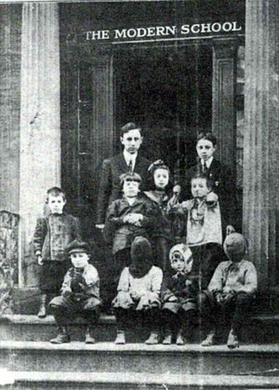 | ( सन् १९११ में न्यूयॉर्क के मॉडर्न स्कूल में अपने शिष्यों के साथ खड़े विल डुरण्ट) |