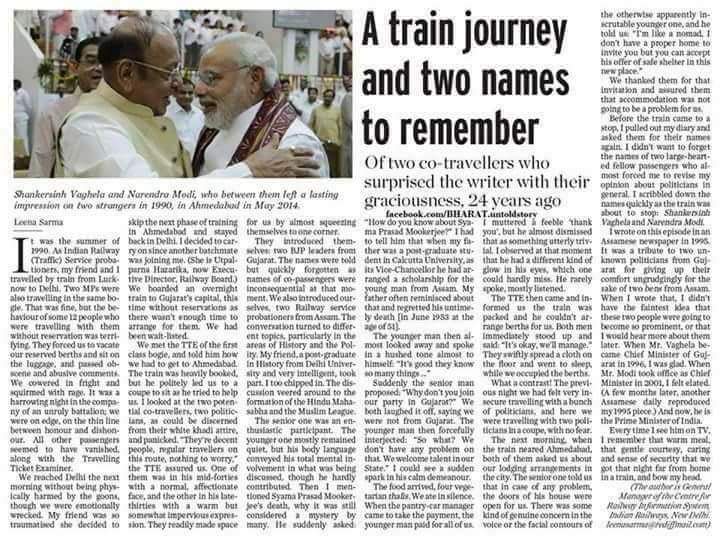 यह स्टोरी 1 जून 2014 में अंग्रेजी अखबार 'द हिंदू' में छपी थी। स्टोरी में गुजरात के दो नेताओं की चर्चा है। करीब 28 साल पहले की एक 'रेल यात्रा' का जिक्र है। जिसमें इन दो नेताओं ने अपने विनम्र स्वभाव से दो अजनबी महिलाओं पर ऐसी गहरी छाप छोड़ी कि वो आज भी इस ट्रेन यात्रा को नहीं भूलती हैं। इंडियन रेलवे (ट्रैफिक) सर्विस की वरिष्ठ अधिकारी लीना शर्मा ने 'द हिंदू' अखबार में लिखे एक लेख में अपनी 90 की दशक की अहमदाबाद यात्रा का जिक्र करते हुए लिखा है-