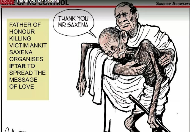 टाइम्स ऑफ़ इंडिया, दिल्ली संस्करण दिनांक 31/05/18 में आज एक कार्टून इस विषय में छापा है। इस कार्टून में दर्शाया गया है कि अंकित के पिता गिरते हुए महात्मा गाँधी को संभाल रहे हैं। और महात्मा गाँधी उनका सत्य, अहिंसा और शत्रु को क्षमा करने के सिद्धांत का पालन करने के लिए धन्यवाद कर रहे हैं। सेक्युलर लॉबी की बाछें इस कार्टून को देखकर खिल गई है। मगर इतिहास हमें कुछ ओर ही बताता है। महात्मा गाँधी ने सदा मुसलमानों के तुष्टिकरण के लिए हिन्दुओं के हितों की अनदेखी की। इसका परिणाम भारत-पाक विभाजन के रूप में निकला। हिंदुओं को सदा अत्याचार सहना पड़ा। आज भी यही हो रहा है।